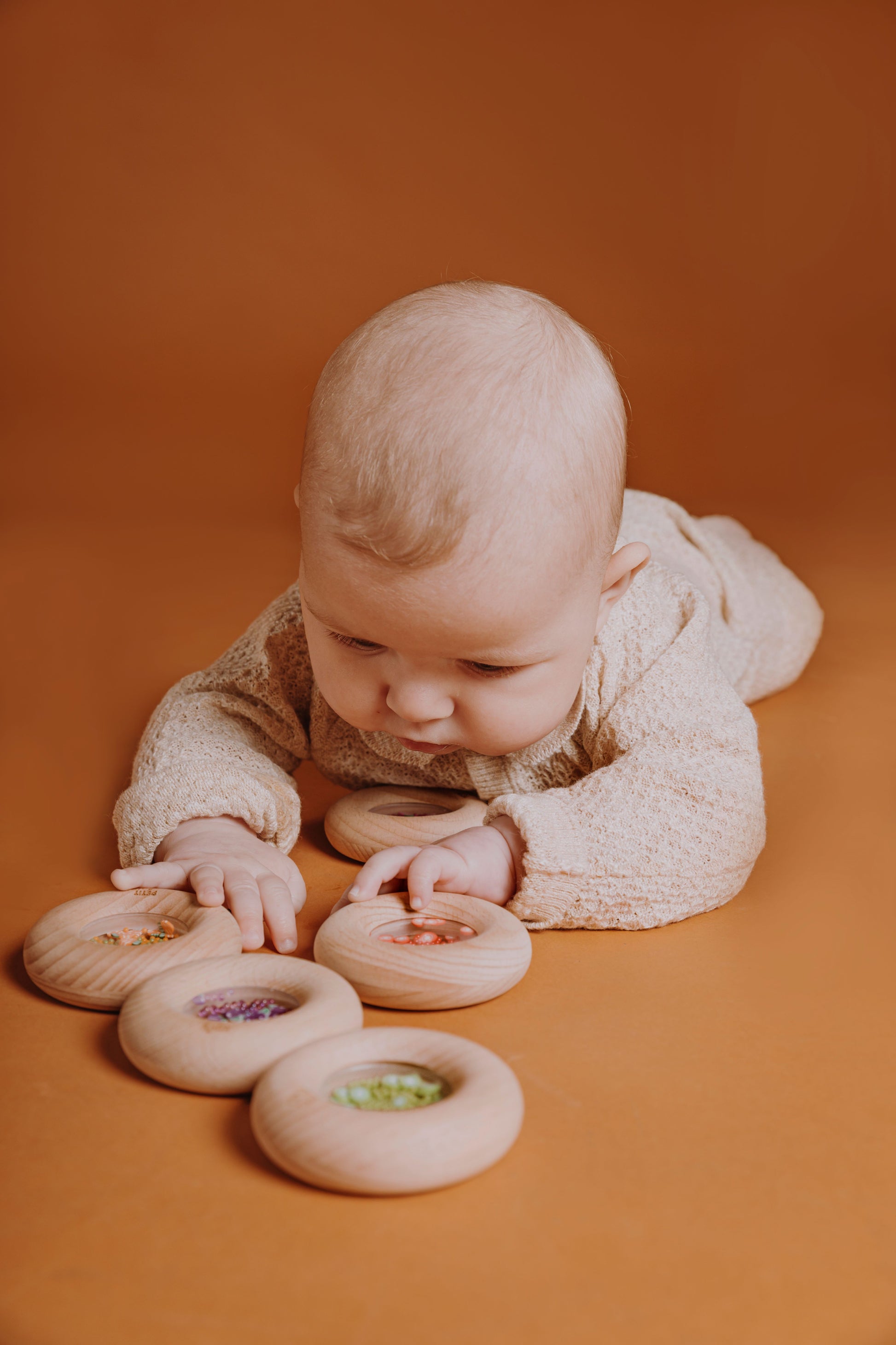 De sensorische donuts van Petit Boum zijn kleurrijke, transparante ringen boordevol glinsterende vulling en zachte geluidjes die de zintuigen stimuleren. Baby’s en peuters kunnen ze makkelijk vasthouden, draaien en schudden voor een betoverende visuele en auditieve ervaring. Ze zijn perfect voor nieuwsgierige handjes en ogen, en bevorderen spelenderwijs de ontwikkeling. Een vrolijk, veilig én magisch speeltje voor de allerkleinsten!