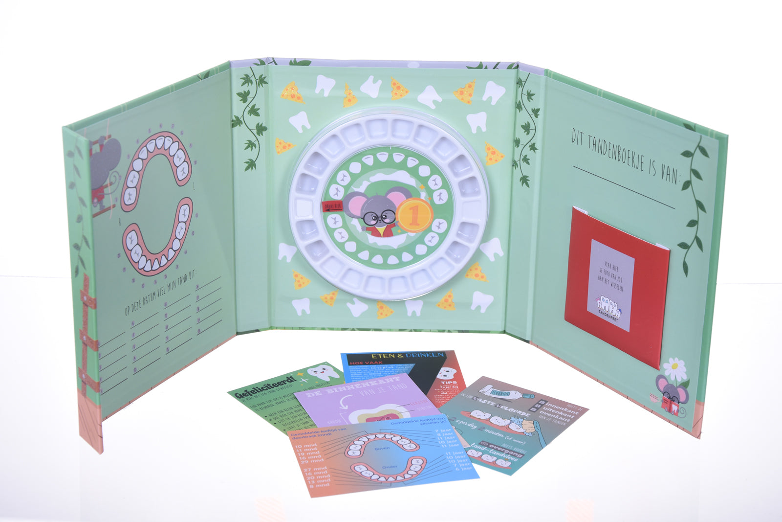 Het boekje bestaat uit een handige houder met draaivakjes waar elke tand zijn eigen plaats heeft. Er is plaats voor een foto en bij elke tand kun je bijhouden wanneer deze gewisseld is. Daarnaast bevat het boekje een vijftal speciale kaartjes die het extra interessant maken voor uw kind. Deze kaartjes beschrijven educatieve weetjes over de tanden vergezeld van leuke tekeningen of bieden ruimte voor eigen (aan)tekeningen van uw kind. De kaartjes hebben een speciaal plekje in het album en nodigen uit om te exploreren en leren.